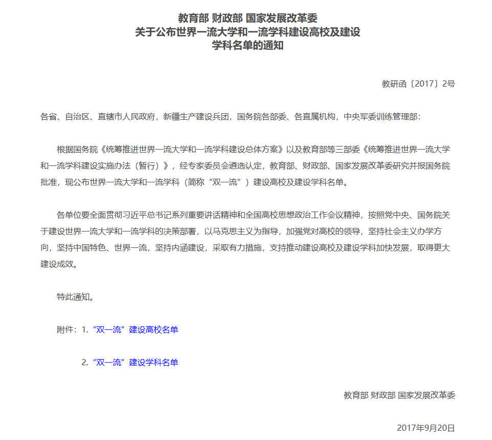 2017年9月20日,教育部、财政部、国家发展改革委《关于公布世界一流大学和 一流学科建设高校及建设学科名单的通知》