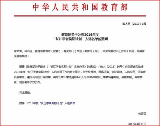 3月31日,教育部关于公布2016年度“长江学者奖励计划”入选名单的通知