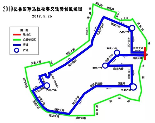 广大师生: 2019长春国际马拉松比赛,将于5月26日(星期日)在我市举行,届时长春市部分路段实行交通管制,在管制期间,禁止车辆在管制区域内通行。我校本部校区位于交通管制区域内,按照长春市政府和公安交警部门的要求,5月26日早6:00至比赛结束,需对本部校区西门、北门、东北门、南门关闭,禁止机动车辆进出。 请学校相关部门和广大师生员工提前做好教学科研、后勤保障以及学习和生活等各项事务活动安排,以免带来不便。 附:2019年长春国际马拉松交通管制区域图
