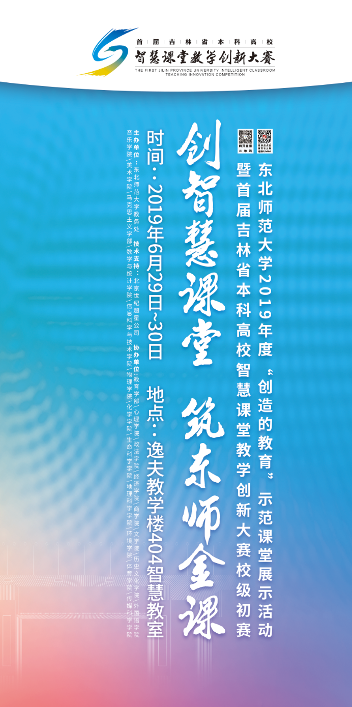 为深入贯彻落实新时代全国高等学校本科教育工作会议精神和学校“创造的教育”理念,充分发挥课程作为人才培养核心要素的作用,打造具有高阶性、创新性、挑战度的东师特色“金课”,学校决定结合“学院本科教学综合改革”建设成果,举办2019年度“创造的教育”示范课堂展示活动暨首届吉林省本科高校智慧课堂教学创新大赛初赛,现将有关事宜通知如下。