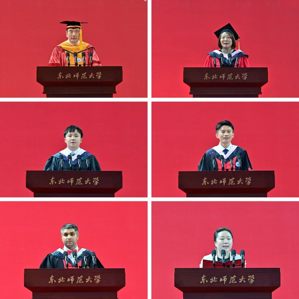 教师代表、传媒科学学院院长史册勉励毕业生铭记校园点滴铸就的情感纽带,传承东师自延安烽火中淬炼的“师道之光”,在未来的道路上携“责任、勇敢、快乐”前行,以教育报国之志续写东师人新的传奇。本科生代表、马克思主义学部2025届本科毕业生秦宇烁分享了自己从汶川考入东师,努力实现青春价值、探索成长意义的故事,将带着东师人的“四实品格”,在平凡的岗位上书写不凡的篇章。研究生代表、经济与管理学院2025届博士研究生谷城表示东师厚重求实、包容开放的精神沃土,滋养了自己为学、为事、为人的坚实根基,立志要以躬耕者的姿态,做一名扎根讲台、播撒希望的人民教师。留学生代表、巴基斯坦籍博士研究生安林代表2025届全体毕业留学生向母校的培养和全体师生表达了感谢,并表示将带着在母校积累的知识,为促进民心相通、推动构建人类命运共同体贡献力量。校友代表、数学系1988级本科校友、全国模范教师、哈尔滨市第三中学校长王健勉励毕业生永葆教育初心,勇立教育潮头,坚持终身学习,将个人理想融入国家发展的宏伟蓝图,与时代发展同频共振,做永不停歇的追光者。