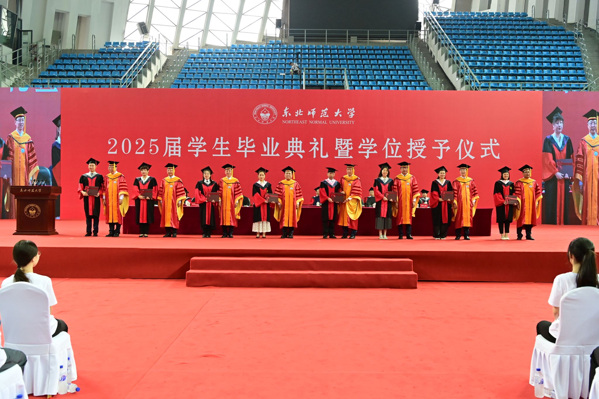 上午8:30,典礼在庄严的国歌声中拉开序幕。学校党委书记李忠军,校长徐海阳,党委副书记兼副校长常青,副校长薛利锋、邬志辉,党委副书记、纪委书记刘九庆,党委副书记庞立生,副校长严蔚刚,党委常委王娜、李红权、解玲,校长助理白冰,校学位评定委员会委员、校友代表、各单位主要负责人、各学院(部)党政班子成员和辅导员老师、毕业生亲友等参加了毕业典礼暨学位授予仪式。典礼由严蔚刚主持。